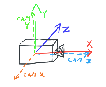 CamX: (0, 0, -1), CamY: (0, 1, 0), CamZ: (1, 0, 0)—we look in the direction of the X axis and the rest follows from that.